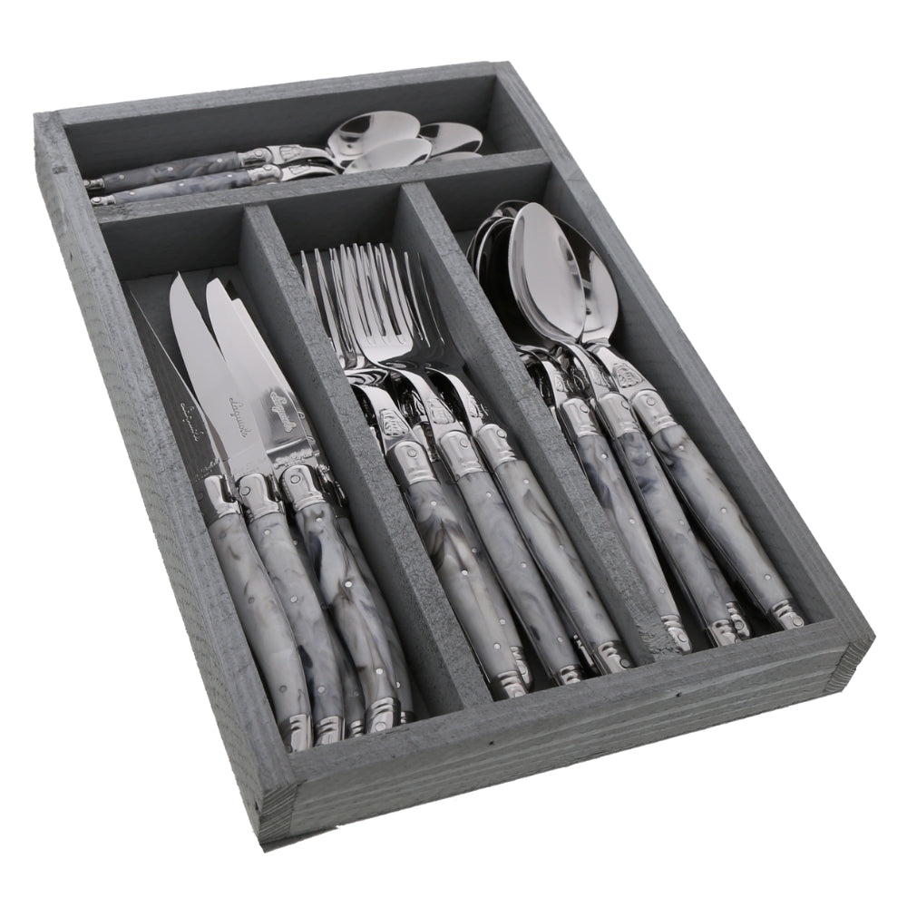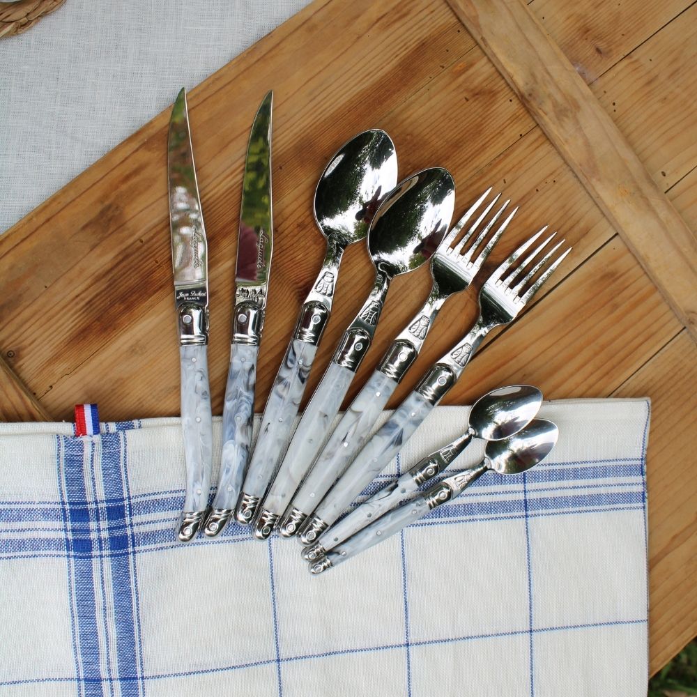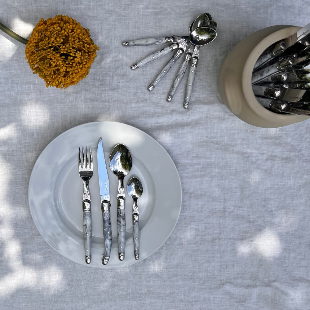 Add a light splash of color to your table with the Jean Dubost 24-piece Everyday flatware set in marble tones. Subtle and elegant, the marble-colored handles bring just the right amount of brightness to your kitchen theme. Perfect for daily meals yet refined enough for special occasions, this set combines timeless French craftsmanship with modern style.