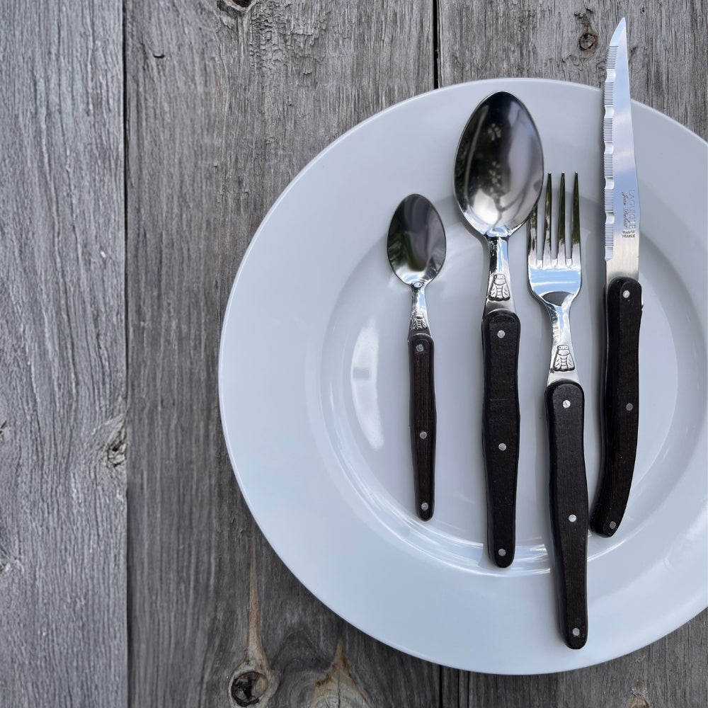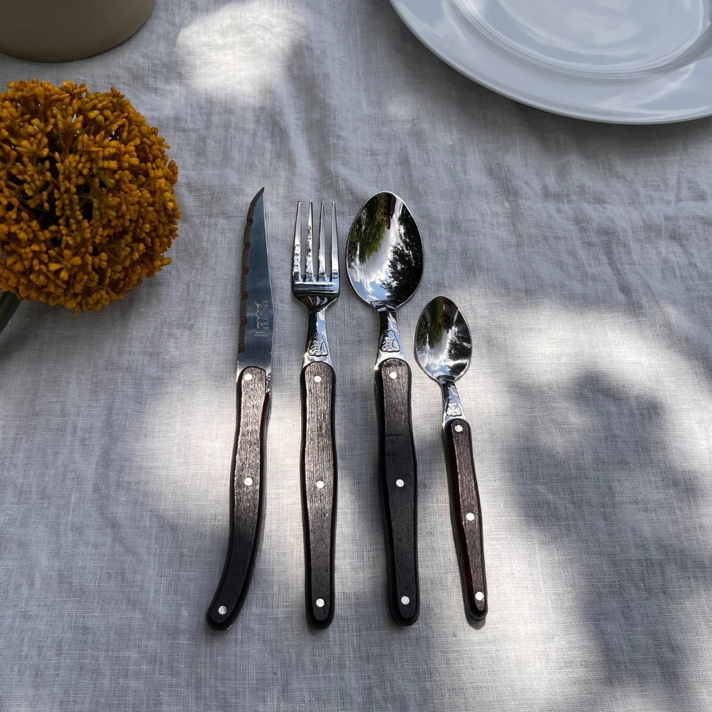 Bring rustic charm and elegance to your table with the Jean Dubost 24-piece Everyday flatware set in Wenge wood. Known for its rich, dark chocolate-brown tone with subtle black veining, Wenge wood is prized for its durability and striking natural beauty. Perfect for both everyday use and formal dining, this set offers a timeless combination of natural materials and French craftsmanship.