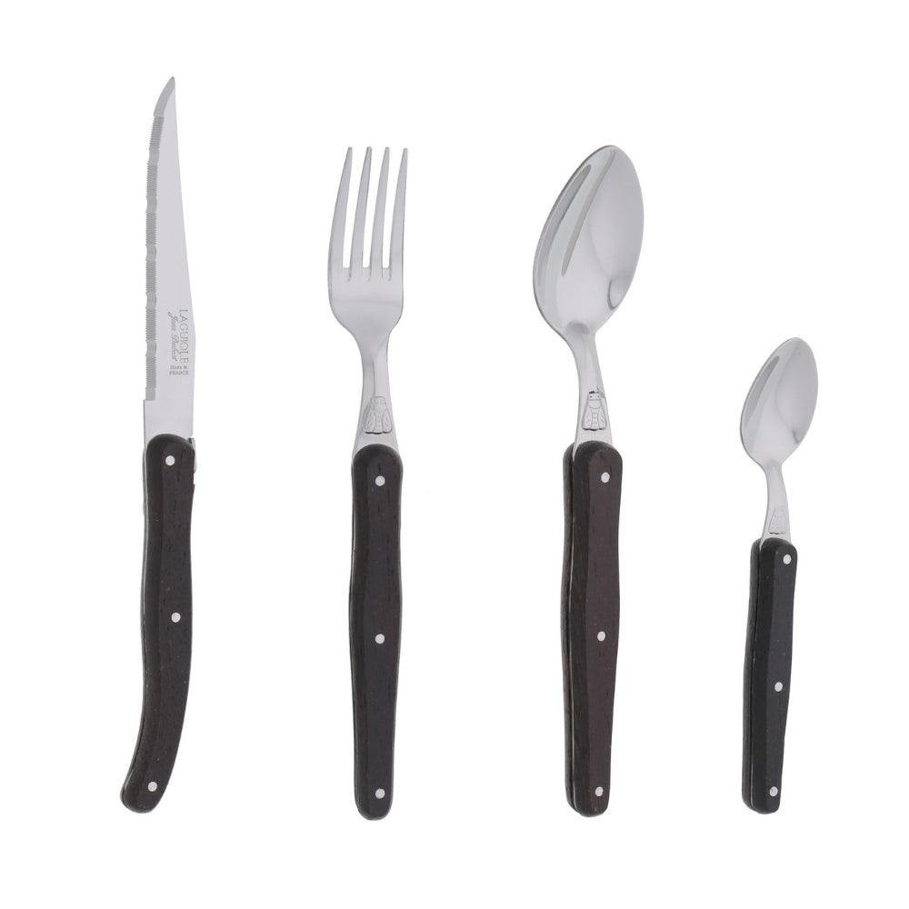 • This set includes 6 forks, 6 knives, 6 soup spoons, and 6 teaspoons with genuine Wenge wood handles.